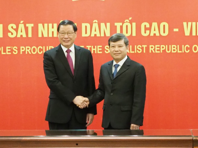 应勇表示,新形势下,中国检察机关愿同越南检察机关一道,全面落实两党最高领导人重要共识,携手为两国经济社会高质量发展和现代化建设、推进共建“一带一路”高质量发展提供优质的法治保障,更好造福两国和两国人民。进一步深化刑事司法领域的务实合作,通过建立司法协助联系人制度、案件定期磋商机制、信息共享交换机制等,不断提高办理质效。进一步完善边境地区检察机关直接合作机制,在相互尊重主权和司法管辖权的基础上,共同打击跨国犯罪,共同维护边境地区社会稳定。进一步加强两国检察人员的交流,通过开展合作培训、人员互访、业务研讨等途径,提升两国检察人员直接交流的深度和广度,加深对彼此国家法律制度特别是检察制度的了解,互相借鉴有益经验,共同提高两国检察人员能力和水平,不断推动两国检察机关友好合作迈上新台阶。