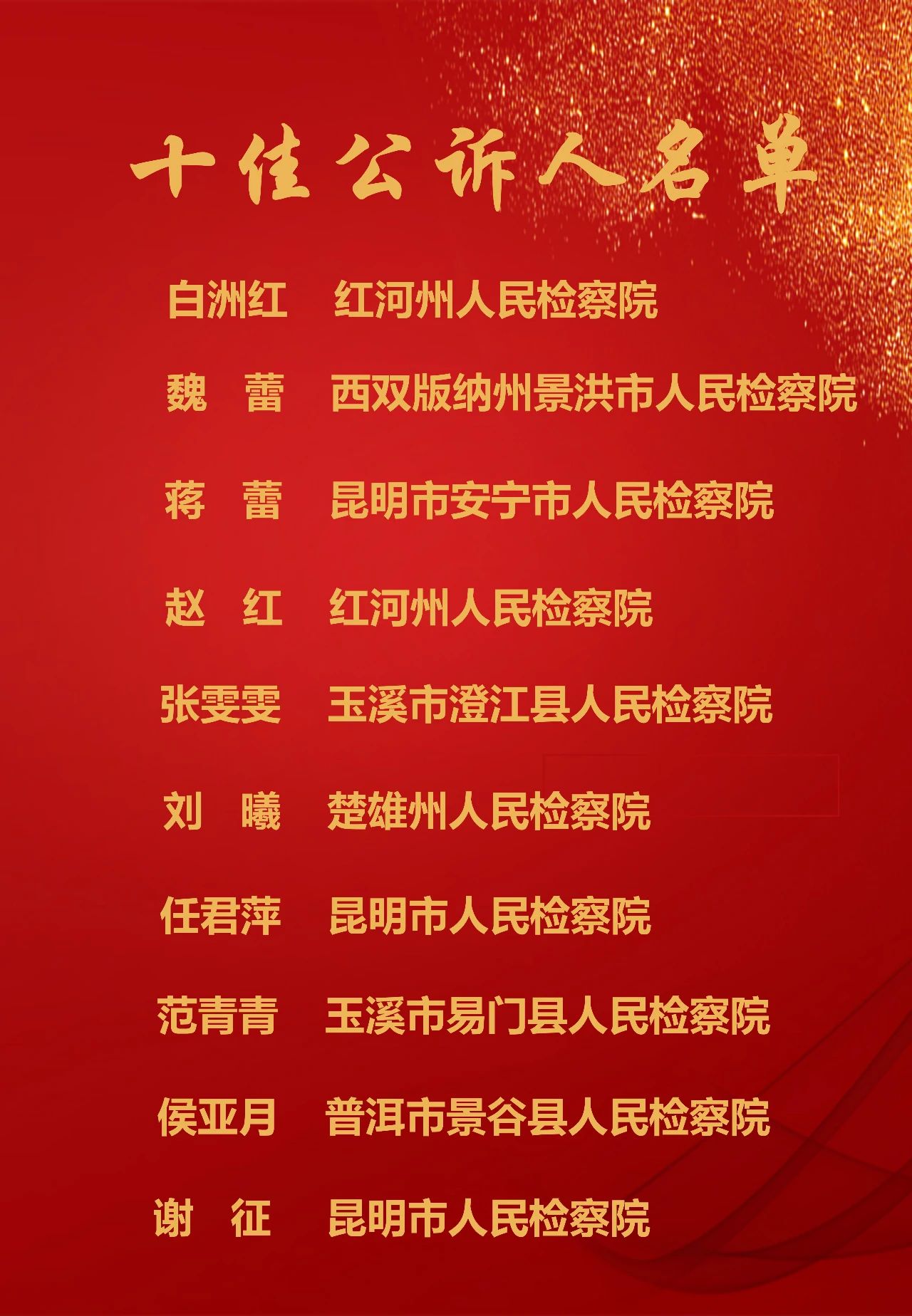 比赛结束的当天下午,云南省检察院召开了本次竞赛的表彰大会,评选出了“全省十佳公诉人”“全省优秀公诉人”“最佳论辩奖”等多个奖项。
