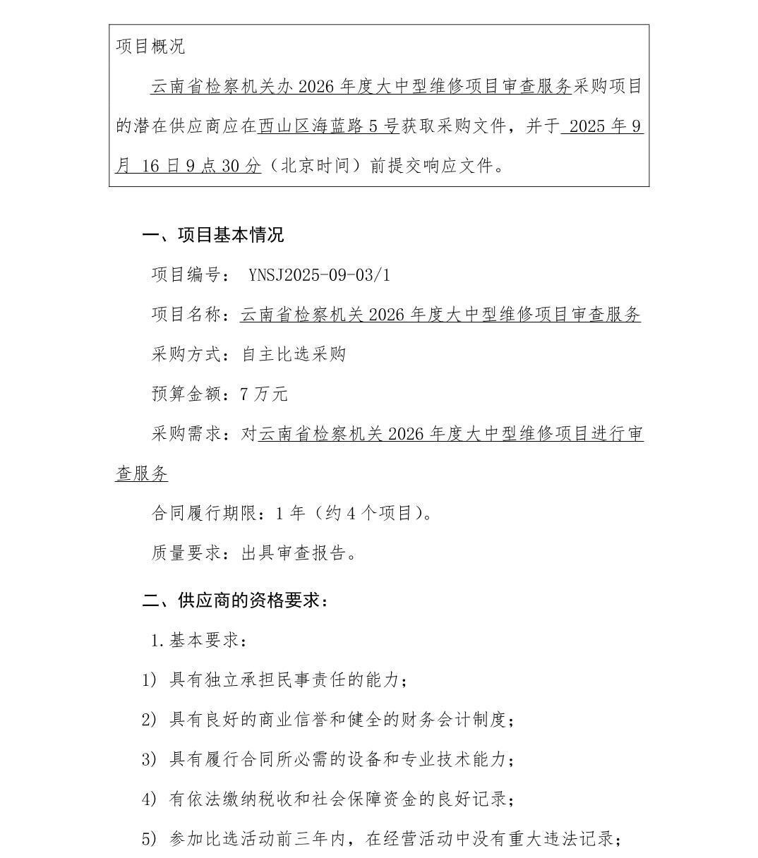 云南省检察机关2026年度大中型维修项目审查服务比选采购公告