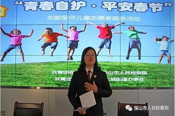 2017年1月22日,兰城社区,一场别开生面的法治安全讲座正在进行。这是保山市检察院和团市委组织的第二次关爱留守儿童的志愿服务活动,为兰城社区湾子小学的30多名留守儿童讲解法律自护知识。一开场,邀请的心理咨询师先带领小朋友开展了有趣的游戏,接下来未检检察官为同学们讲授了交通安全、消防常识、饮食安全等关乎未成年人自身安全的重要知识,同时通过生动案例的讲解,让同学们知道了什么是犯罪、犯罪的危害后果、如何预防犯罪等法律知识,并鼓励同学们从小就做一个自尊、自重、自警、自律的好孩子。