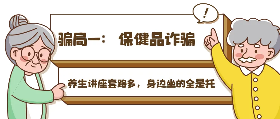 骗子利用老年人注重养生的心理,打着免费赠送鸡蛋、水果等幌子,租用场地开展老年人养生讲座,向老年人宣传保健药品。之后找托“反馈”使用效果,让老年人相信所谓的保健品能“治百病”。在老年人被成功洗脑后,高价售卖保健药品。