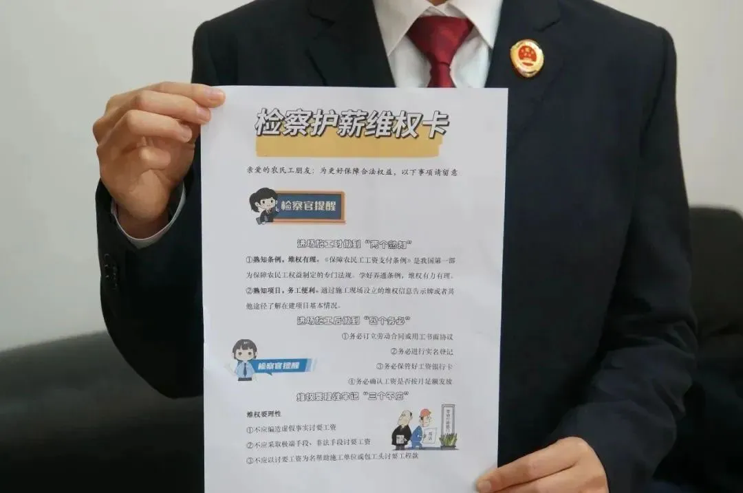 在接访过程中,承办检察官了解到,春节后张某和工友们将再次踏上打工的行程,便向张某进行了法治宣传,给张某和工友们发放了检察护薪维权卡,从进场施工前、进场施工后及合法理性维权三个方面提示农民工群体依法维护合法权益。