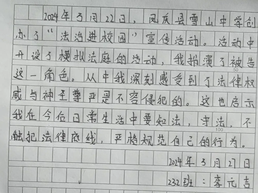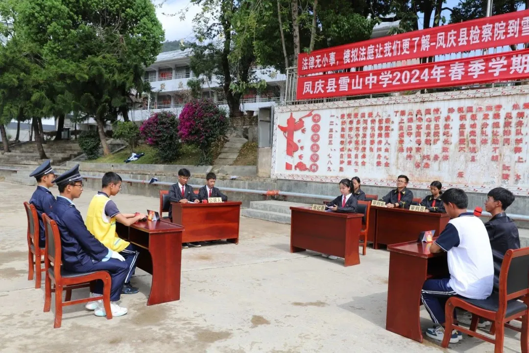 近日,凤庆县检察院联合雪山镇司法所、派出所、综治办在凤庆县雪山中学以“情景剧+模拟法庭+现场普法问答”的方式开展一次“沉浸式”普法。11名学生穿上制式服装,完成了审判人员、公诉人、书记员、法警、辩护人、被告人的角色扮演,并按照法庭调查、举证质证、法庭辩论、法庭教育、最后陈述、当庭宣判完成了刑事审判的整个流程。