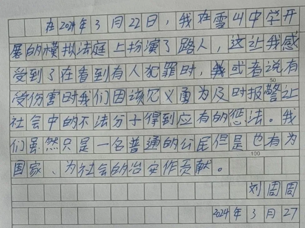 “庭审对于同学们来说是一个全新的法治实践课程,是《道德与法治》的直观呈现,大家在模拟法庭中的表现令人十分欣喜,值得表扬和肯定。”