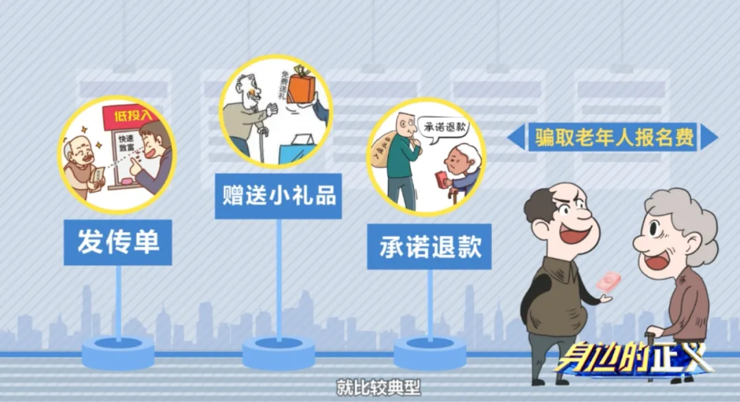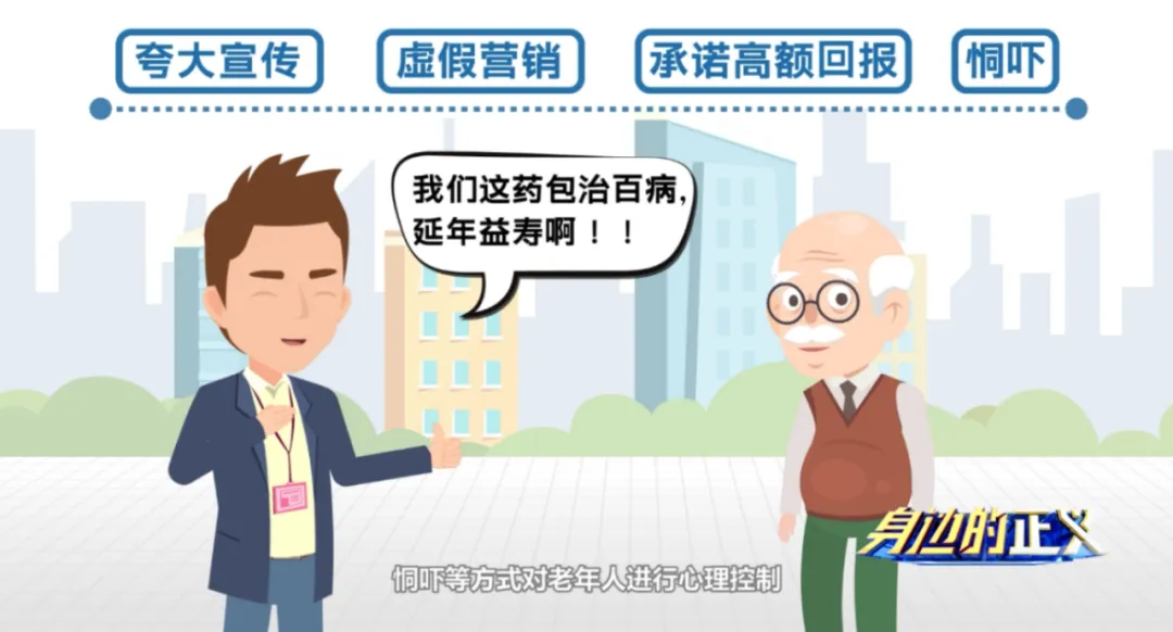 这些诈骗活动和传销有相似之处,很多针对老年人售卖的保健品、理财产品、收藏品,往往会采用夸大宣传、虚假营销、承诺高额回报、恫吓等方式对老年人进行心理控制,诸如“投入几百块,换你大健康”这样的口号,诱导老年人不断购买产品,引导他们主动宣传,甚至带家人参加、发展下线,身陷这样的骗局,老年人可能在不知不觉中就会成为传销的帮凶。
