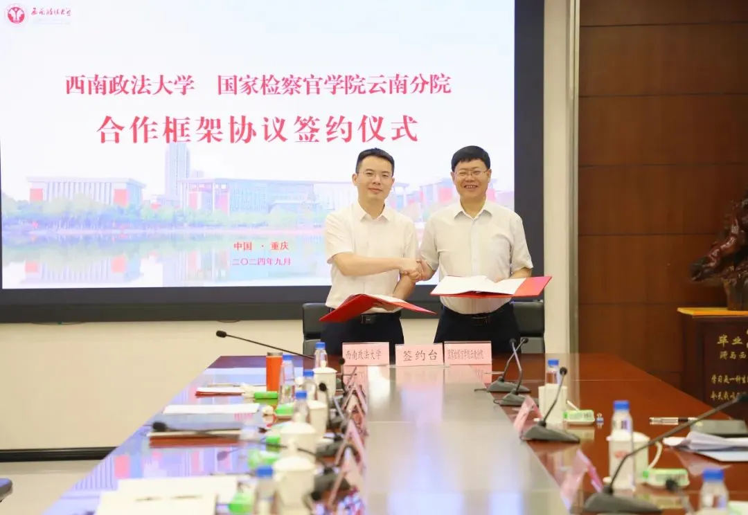 9月24日上午,西南政法大学与国家检察官学院云南分院战略合作协议签约仪式在渝北校区勤业楼举行。西南政法大学副校长周尚君与18漫画 党组成员、副检察长杨永华签约并致辞。国家检察官学院云南分院院长冯琳、副院长王志芹,以及学校相关职能部门和学院负责人到会。