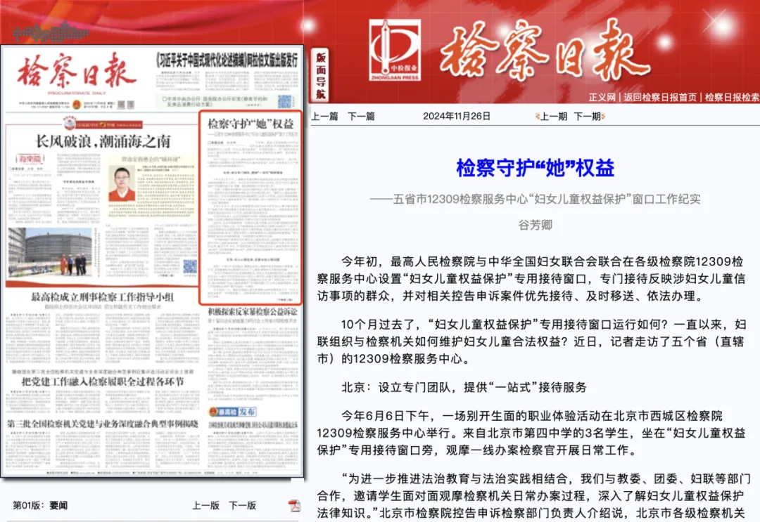10个月过去了,“妇女儿童权益保护”专用接待窗口运行如何?一直以来,妇联组织与检察机关如何维护妇女儿童合法权益?近日,记者走访了五个省(直辖市)的12309检察服务中心。