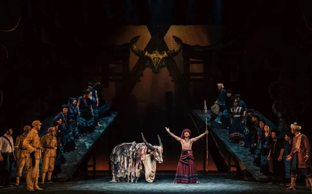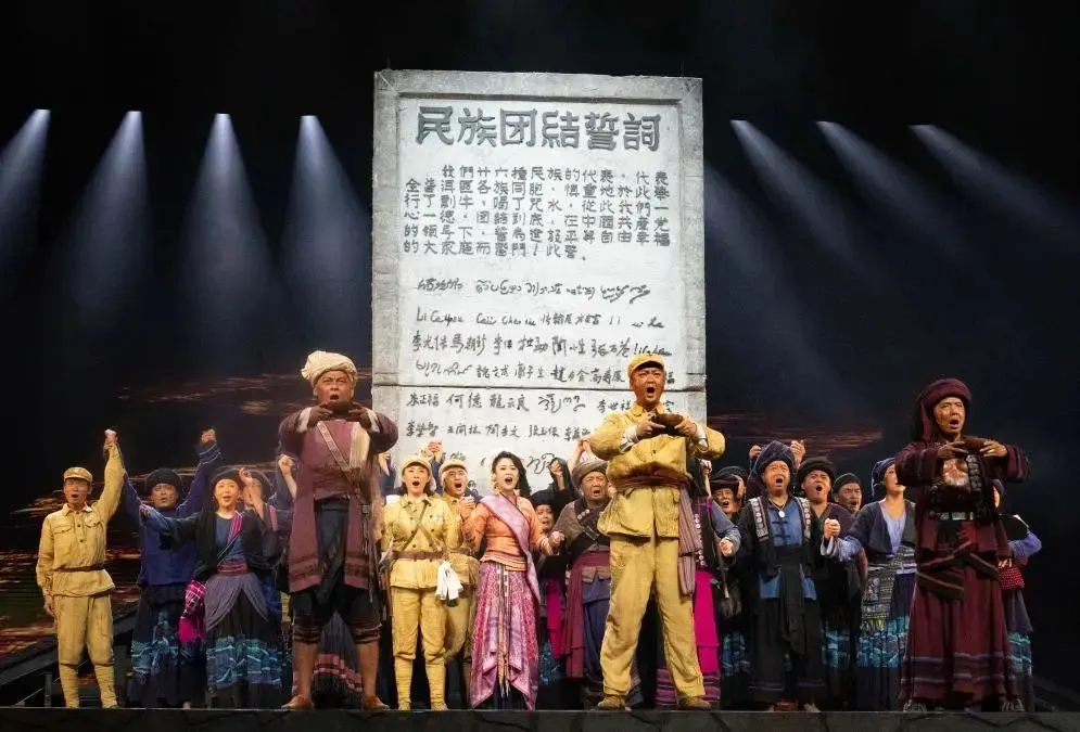 剧中高潮“剽牛盟誓”仪式中,鼓声震天,26个民族代表高举酒杯,以“喝咒水”的古老习俗立下誓言:“一心一德,团结到底,跟党走!”舞台中央,象征民族团结的誓词碑缓缓降下,演员们以极具张力的表演展现了各族儿女从犹疑到坚定的心理转变,让观众真切感受民族工作的艰辛历程、民族团结的弥足珍贵。