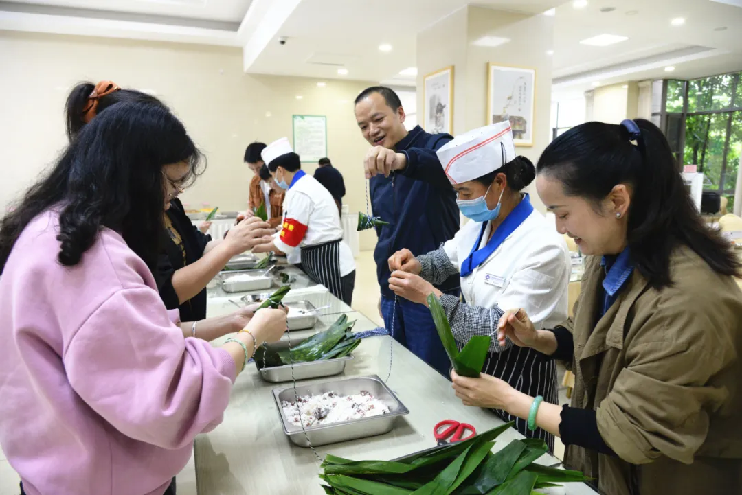 活动现场,检察人员们围聚一堂,翠绿的粽叶在手中灵巧翻转,雪白的糯米裹着蜜枣、腌肉等馅料将粽叶填满,五彩丝线轻轻缠绕,一只只形态饱满的粽子迅速成型,空气中弥漫着粽叶的清香与欢声笑语。