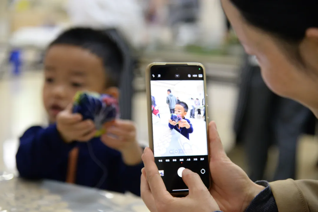 活动特别邀请了两位非遗扎染技艺传承人进行现场指导,折叠、捆扎、染色…… 看似简单的步骤,却蕴含着无限可能。大家发挥天马行空的想象,将白布扎成各种形状,用橡皮筋绑出不规则纹路,当白布浸入靛蓝、茜草等植物染液中,色彩如同春日繁花般在布面晕染开来,解开捆扎的瞬间,冰裂纹、云纹等独特图案跃然眼前,原来传统扎染这么有趣,我还想再学染一个花色。一名小朋友举着自己的作品兴奋地说。