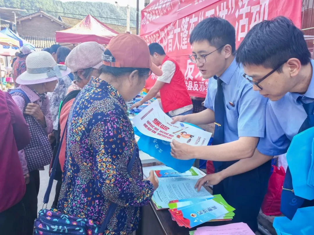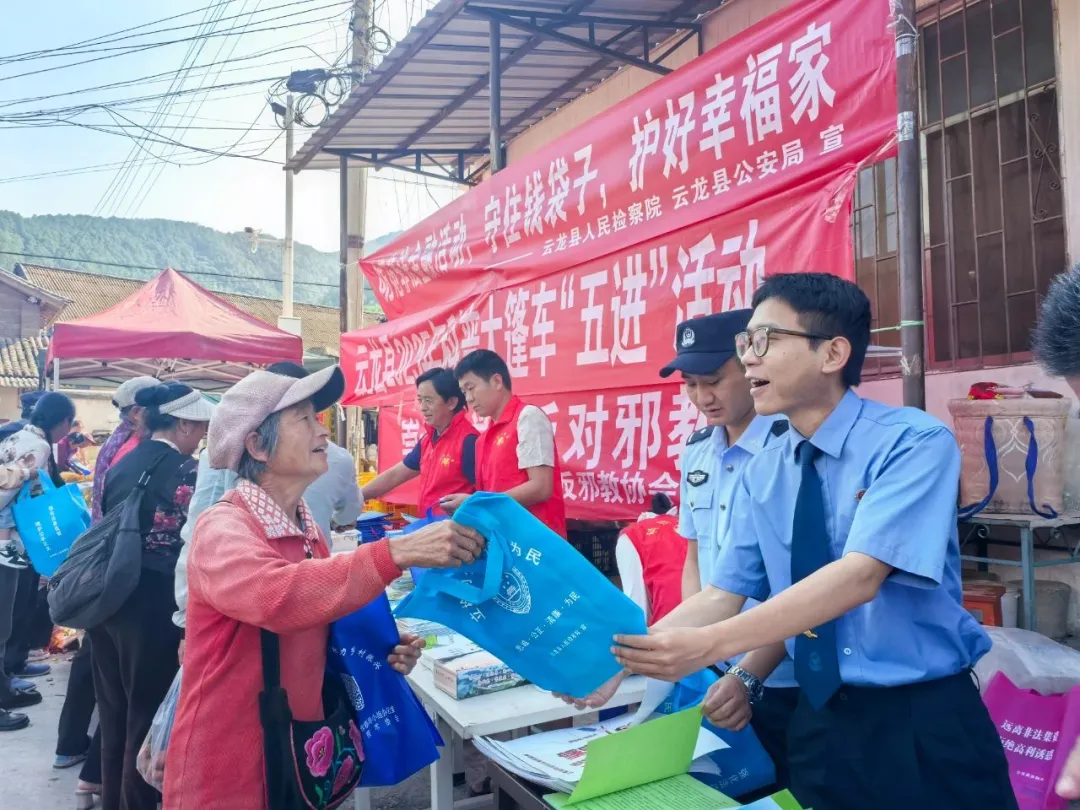 近日,云龙县检槽乡“赶街日”的集市上摆满各式摊位,集市口悬挂着印有“防范非法金融活动 守住钱袋子 护好幸福家”的标语格外显眼,这是云龙县检察院联合县公安局开展的防范非法金融活动法治宣传。“我很不识字,你们这么一讲我就听懂了。”过往的群众指着宣传手册说。活动现场,检察人员和公安民警向赶街群众和周边店铺发放宣传材料,面对群众的咨询,检察人员耐心解答,以案释法,用少数民族语言把宣传材料上的内容讲解给群众,引导群众提高辨别能力,提升防范意识,深刻认识非法金融活动和各类诈骗的危害,保护个人信息和财产安全。