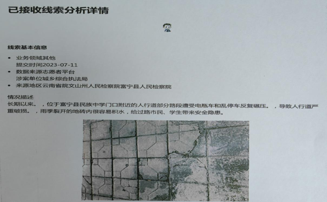 2023年7月11日,富宁县检察院收到志愿者提报线索:“县民族中学门口路段人行道部分路段遭受电动自行车乱停车和反复碾压,导致人行道严重破损,雨季裂开的地砖内容易积水,给过路市民、学生带来安全隐患。”