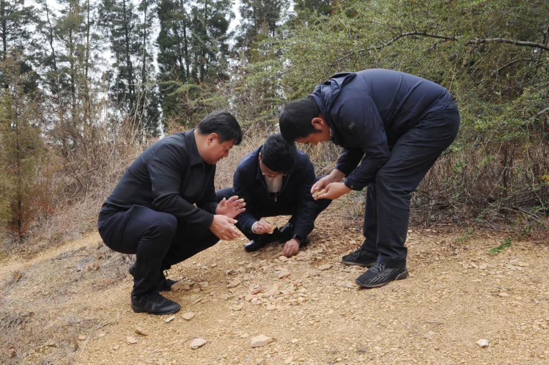 ▲云南省玉溪市检察院检察长张仕明(左)与郭进代表(右)一起调研古生物化石群保护工作。