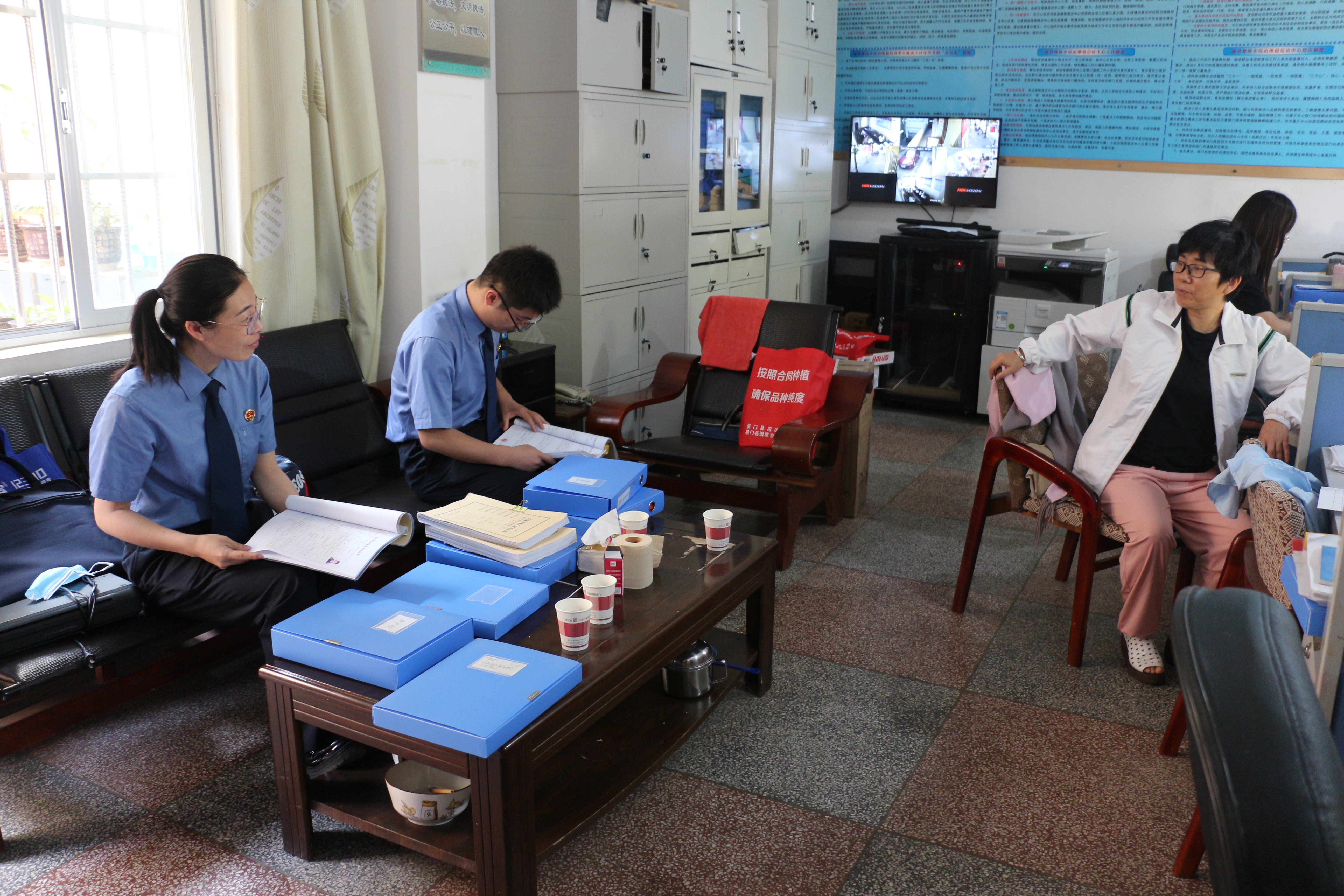 范青青(左)与同事到村委会了解案件相关情况。